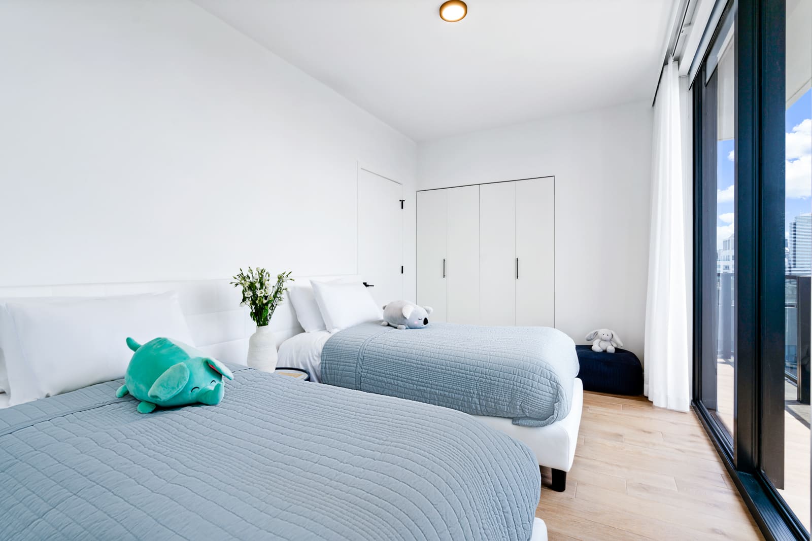 Espaciosa, sofisticada y cuidadosamente diseñada para la accesibilidad, la suite ADA de tres dormitorios con vista a la ciudad (cama king/queen/dos camas individuales) de The Elser Hotel ofrece una estadía lujosa y apta para personas de movilidad reducida en el corazón del centro de Miami. Esta suite de 1,200 pies cuadrados cuenta con una habitación con cama king, una habitación con cama queen y una tercera habitación con dos camas individuales, perfecta para familias o grupos que viajan con necesidades variadas. Cada habitación incluye ropa de cama lujosa, armarios al estilo californiano y acabados de diseño en todas partes.
